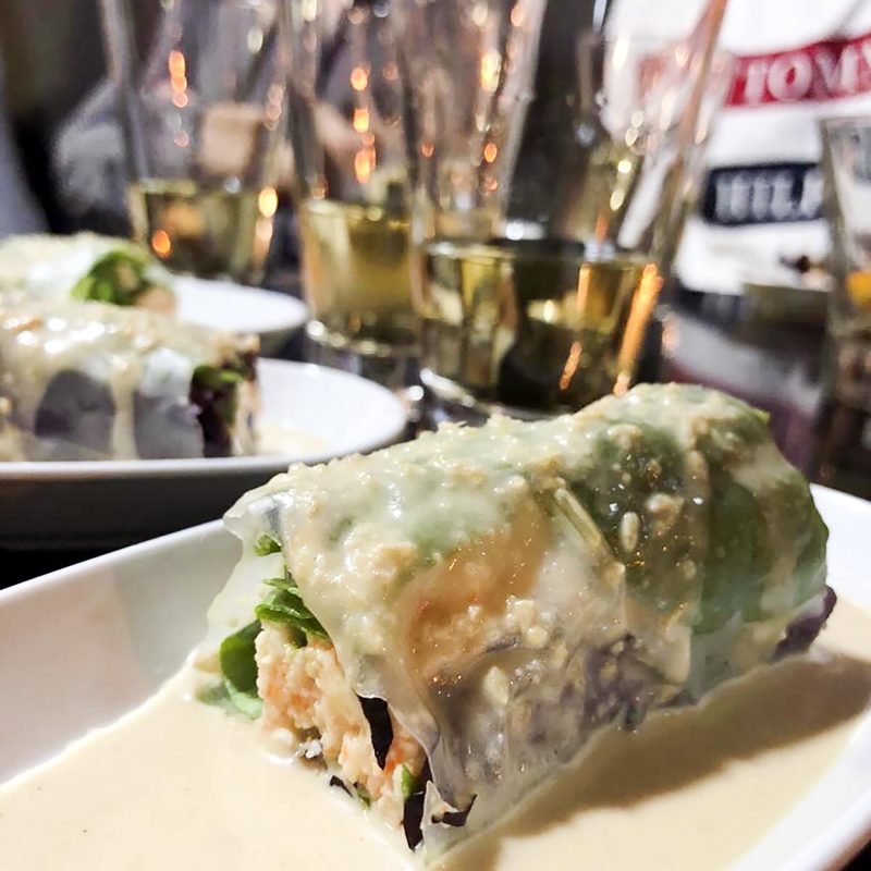 NOMBRE DE LA TAPA: ROLLITO CALIFORNIA: Oblea de arroz rellena de cocktail de gambas con salsa del caldo de sus cabezas, ajo confitado, jengibre confitado, salsa de soja, aceite de sésamo y salsa de ostras.