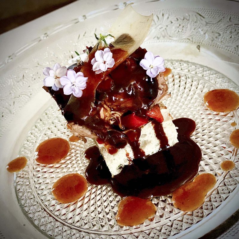 NOMBRE DE LA TAPA: BARBACOA DE DOMINGO: Ternasco a baja temperatura aramatizado con hierbas del campo sobre cama de piquillos y papillote de cebolla y salsa barbacoa divino (cebolla y borraja con tomate frito casero, miel y especias mudéjares como jengibre, canela y nuez moscada).
